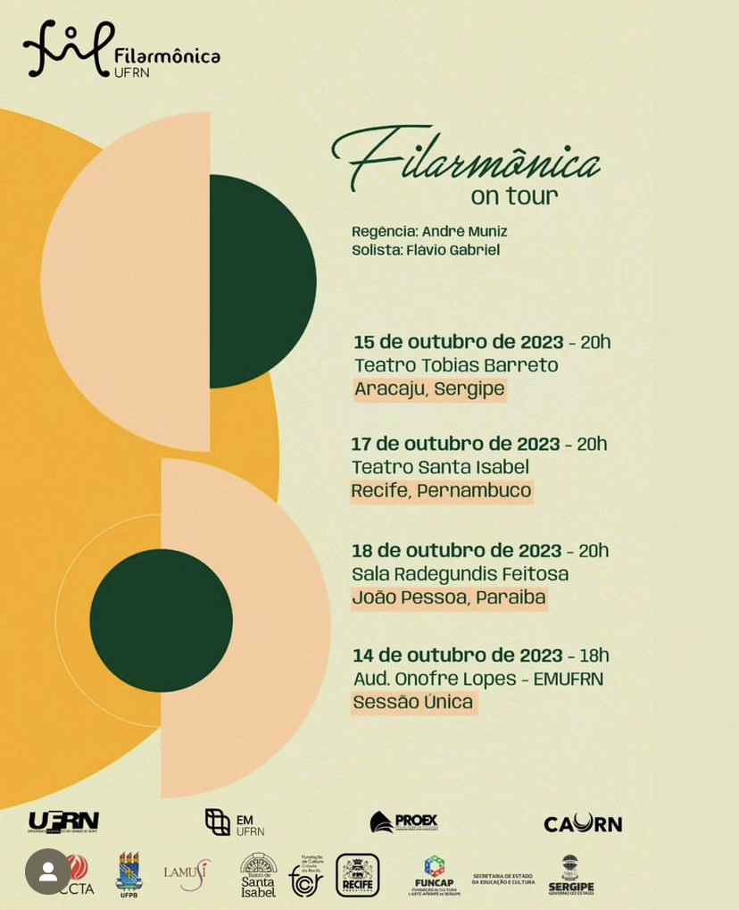 Caros amigos, a Filarmônica UFRN realizará, nos próximos dias, sua Turnê pelo Nordeste, com concertos gratuitos em Natal, Aracaju, Recife e João Pessoa.